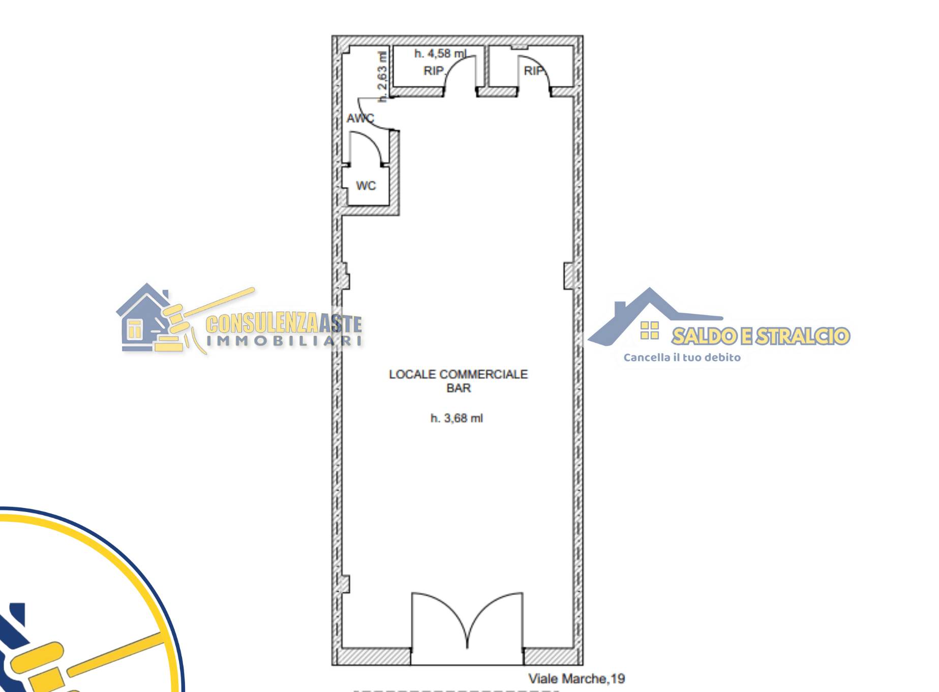 Il locale commerciale in questione, destinato a bar, è ubicato al piano terra. Interamente si compone di un ambiente principale, destinato alla vendita e alla somministrazione di bevande, direttamente collegato con tre ambienti, di cui uno costituito da antibagno e bagno, il secondo a ripostiglio e il terzo destinato ai video giochi. Il tutto sviluppa una superficie complessiva di 79 mq.