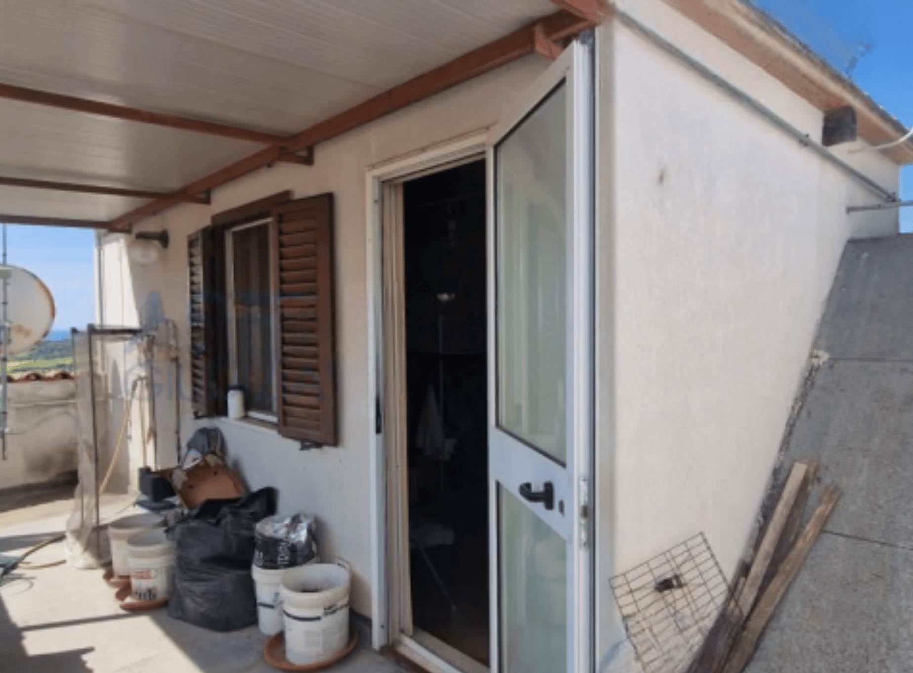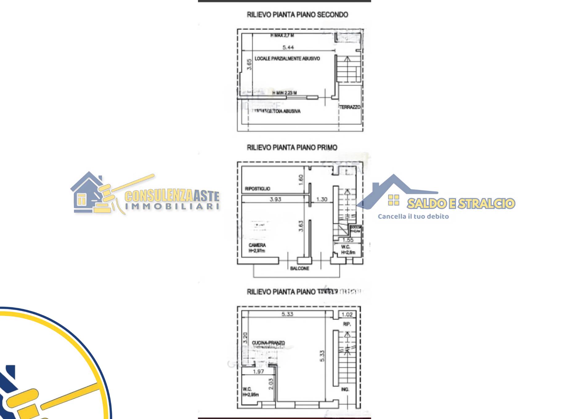 Si sviluppa al piano su tre livelli. Nello specifico il piano terra è costituito da ingresso, cucinino/soggiorno/pranzo, bagno e ripostiglio; Il piano primo è costituto da disimpegno, due vani, un bagno e un balcone e secondo piano (lastrico solare) costituito da vano e terrazzo parzialmente coperto da tettoia (bucataio) il tutto collegato mediante scala interna. L'unità si completa da un'area scoperta di circa 69 mq.