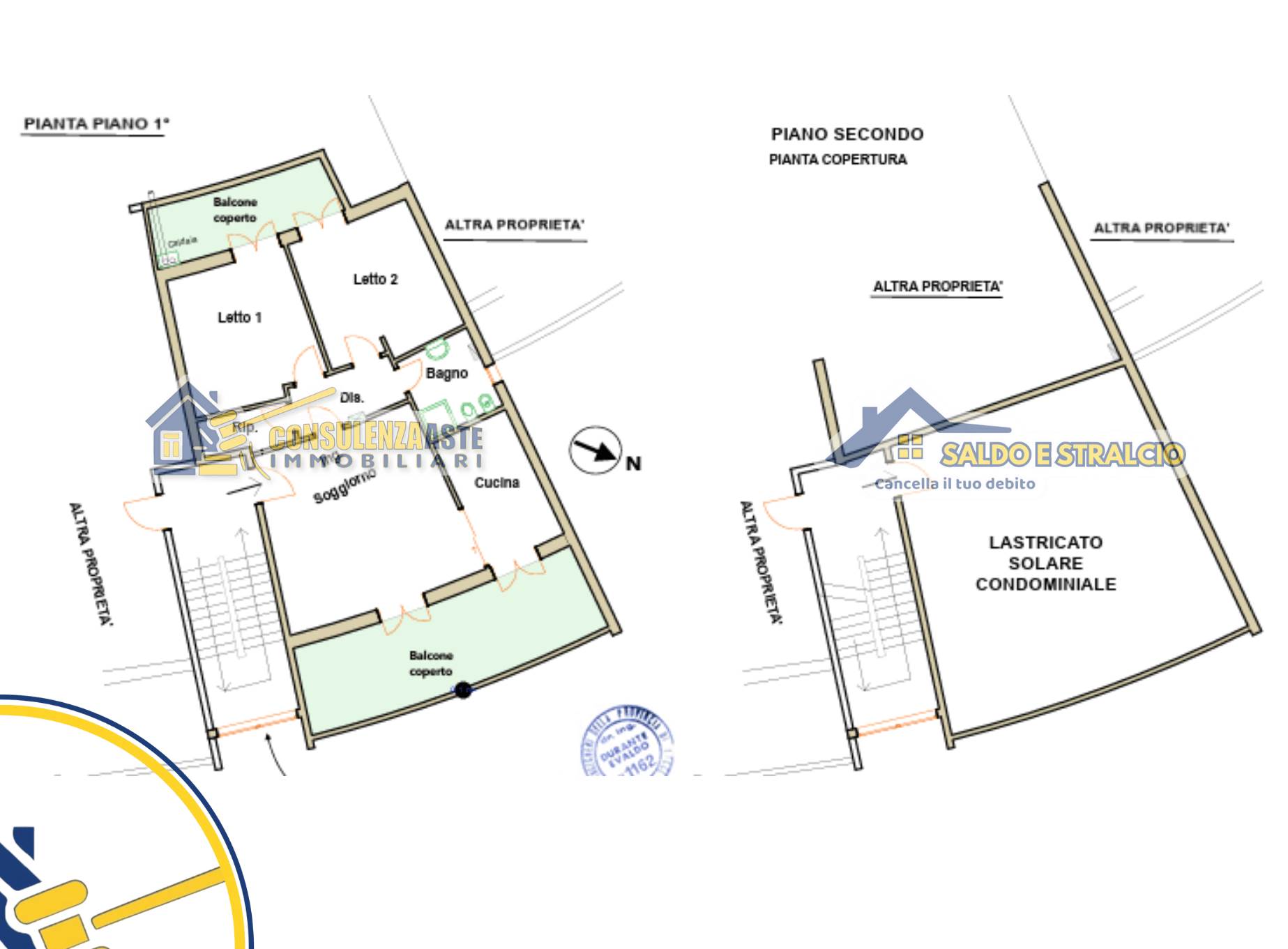 Si sviluppa al piano primo. L'immobile risulta così composto: soggiorno-pranzo, cucina, due camere da letto, bagno e ripostiglio, per una superficie di 104 mq., oltre a due balconi di 25 mq. e 9 mq.